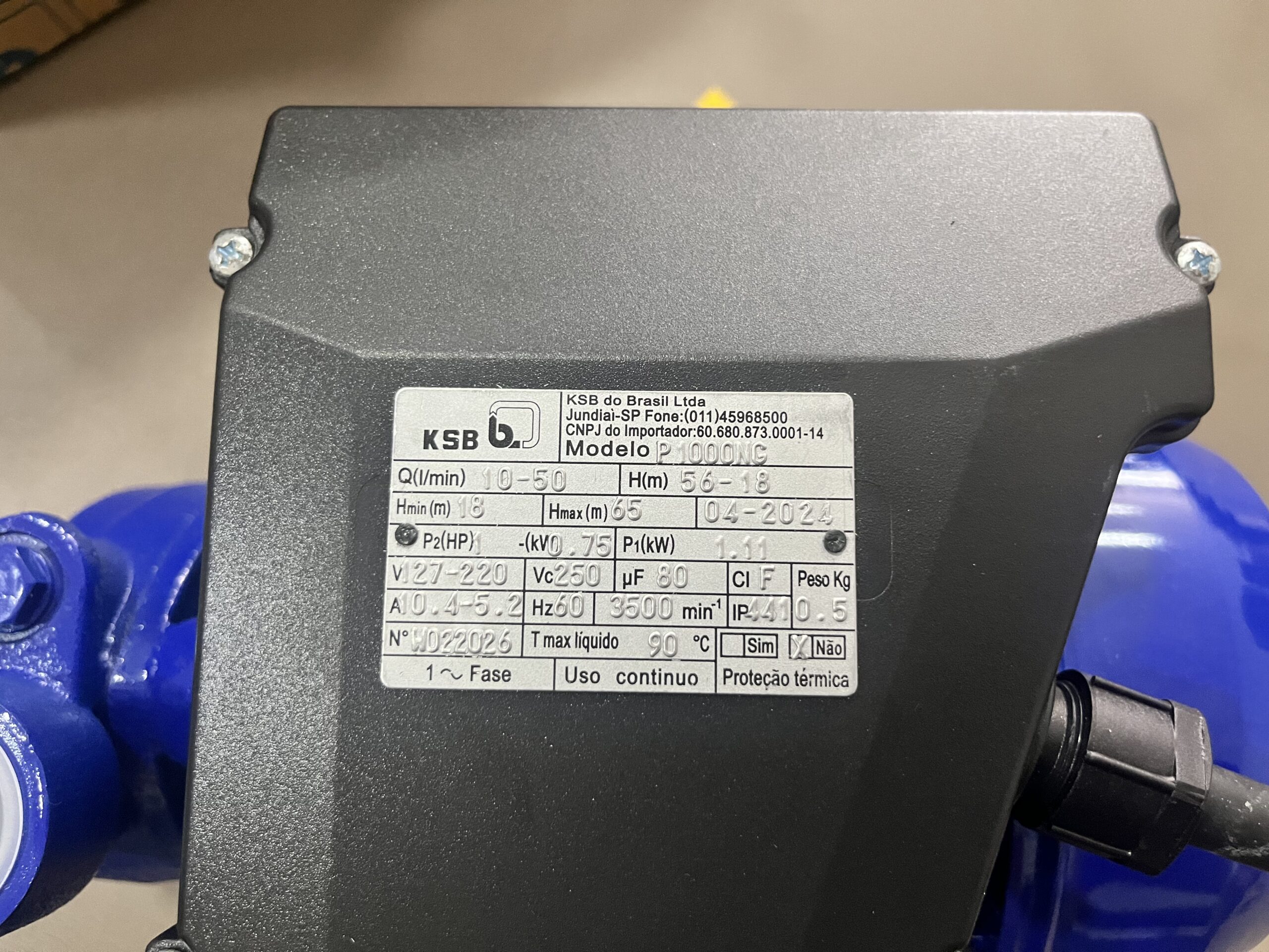 A Bomba Submersível P1000NG KSB, é indicada para o bombeamento de água limpa. Possui motor de indução do tipo fechado, bivolt e autoventilado, grau de proteção IP44 e isolação classe F, adequado para uso contínuo.