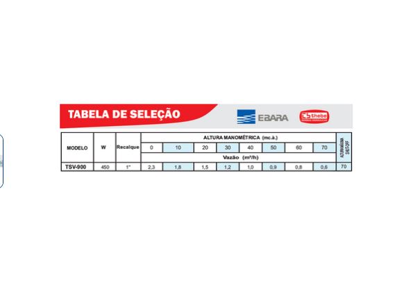 Grau de proteção IP68 Fornecedor Motor THEBE Voltagem 127 V Número de Fase MONOFÁSICO Potência 0,60 cv Pressão Máxima 70,0 mca