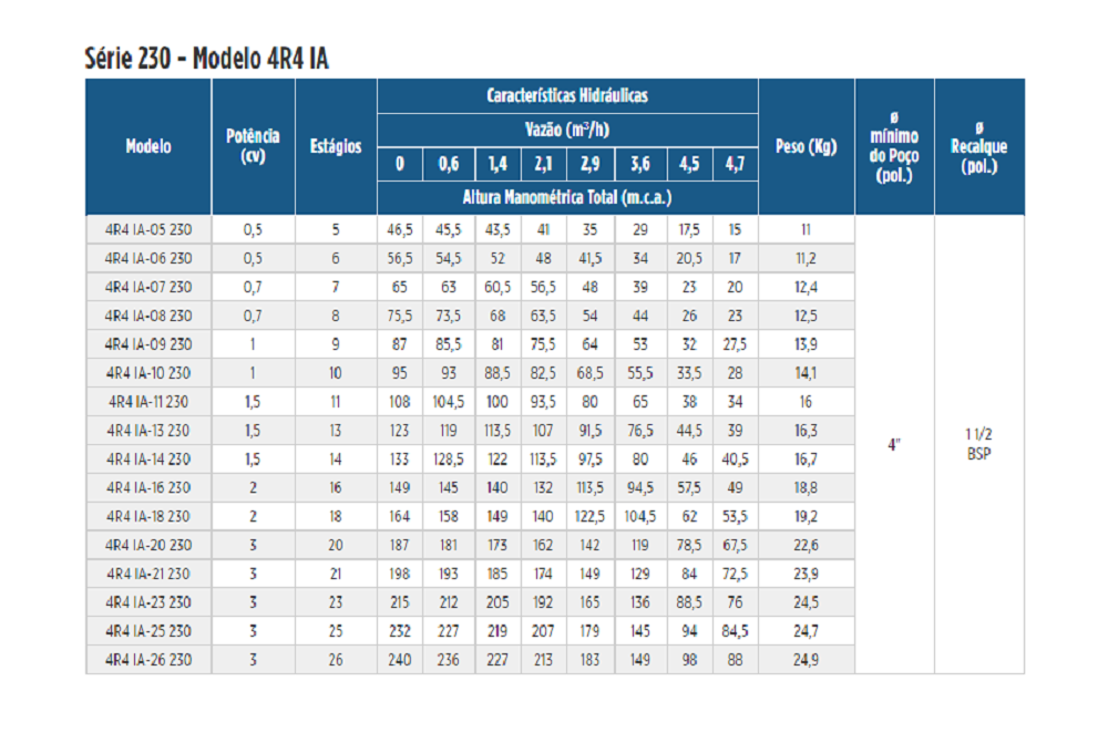 • Submergência mínima recomendada: 6 metros abaixo do Nível Dinâmico.